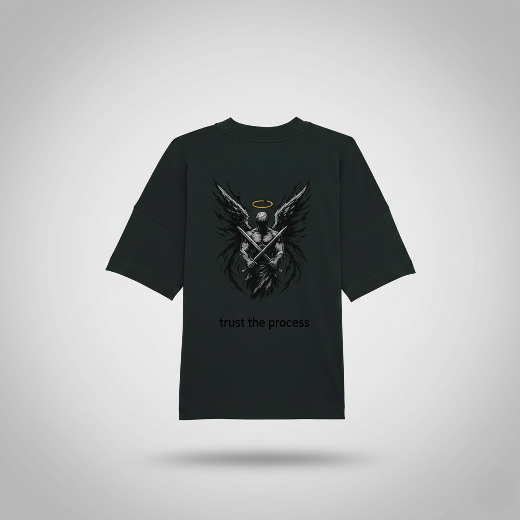 This oversized casual t-shirt is made from 100% combed ring-spun organic cotton for comfort and durability. It features set-in sleeves, a ribbed neckline with a contrasting fabric neckband, and reinforced stitching on the sleeves and hem. For best care, wash inside out with similar colors and avoid ironing the print.